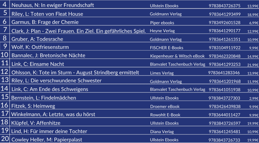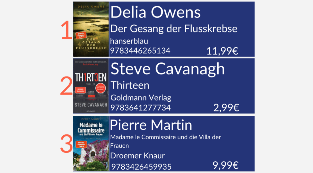 Delia Owens holt sich mit ihrem Roman „Der Gesang der Flusskrebse“ den ersten Platz, gefolgt von Steve Cavanagh mit dem Thriller „Thirteen“ auf Platz 2 und dem Krimi „Madame le Commissaire und die Villa der Toten“ von Pierre Martin auf Platz 3.
